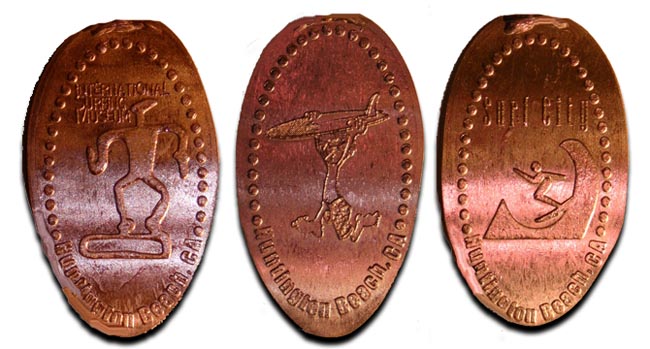 411 Olive Ave Huntington Beach, CA , 92648 Phone: 7149603483 Three different pennies available, art deco surf themes. There is no fee to visit the museum.