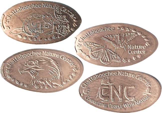 Machine 1- Located in the Gift shop. All designs have "Chattahoochee Nature Center": Costs $0.51 for each press.