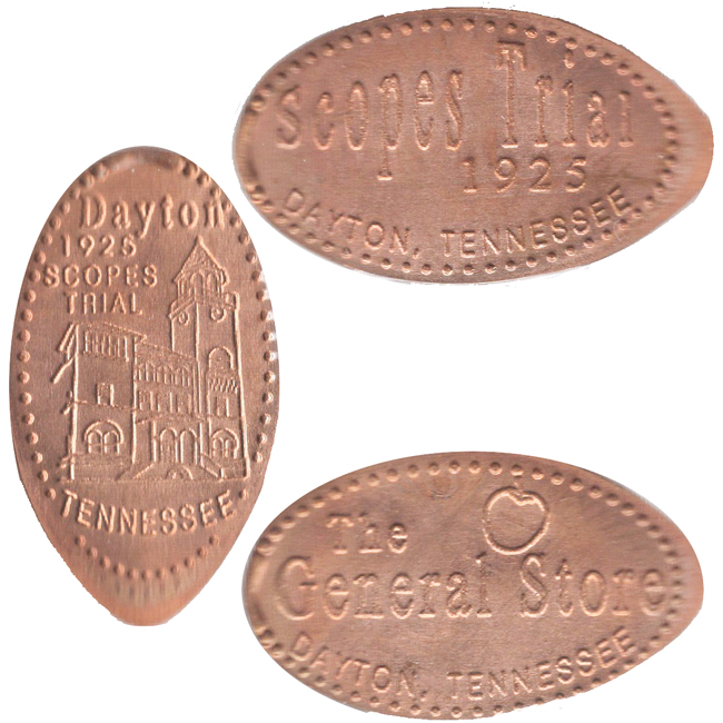 Machine 1 is inside on the sales floor and contains 3 Pennies featuring the Scopes Trial. Designs all have a beaded border with 'Dayton Tennessee':