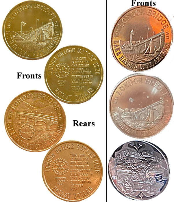 2) 'London Bridge, Lake Havasu City Arizona', bridge with mountains behind and a logo in front/ Rear- 'London Bridge Rotary Club, Havasu Dollar',