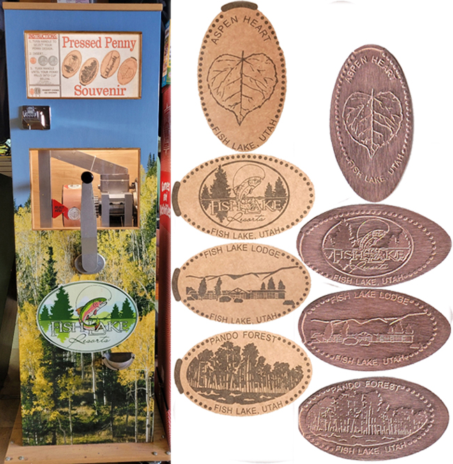 Machine 1 is inside the General Store. Cost to press: 51¢ each design. Designs all have a beaded border with 'Fish Lake, Utah':