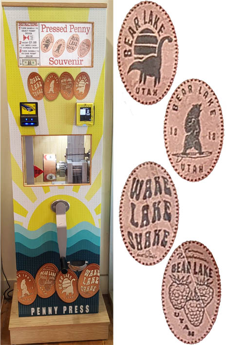 4 designs including: 1) Bear on a surfboard, 2) Bear Lake Monster, 3) Wake Lake Shake logo. 4) Bear Lake, Utah, Raspberries
