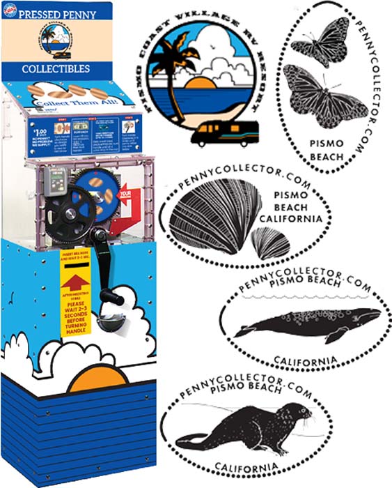 To reach the machine, you pull into the park from the security gate and proceed straight ahead to find parking. Look for the blue awning that's marked Restaurant. The Arcade is to the left of the Restaurant. The penny machine is inside the Arcade. Cost to press: $1.00 each design (dollar bills only; no quarters accepted). No pennies required. This is a new type PennyCollector machine that accepts a $1.00 bill for each design, or a credit card for a $4.00 charge for all four designs only, and after hand cranking, presses a pre-loaded zinc penny. Designs all have 'Pismo Beach': on them.