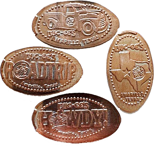 The cost is 51 cents per press and you use your own penny. All have 'Buc-ee's Amarillo, Texas' on them. Designs are: