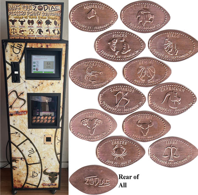 Machine 1 is just inside the entry doors to the right. Cost to press: 51¢ each design. Designs all have a beaded border and their respective astrological sign: