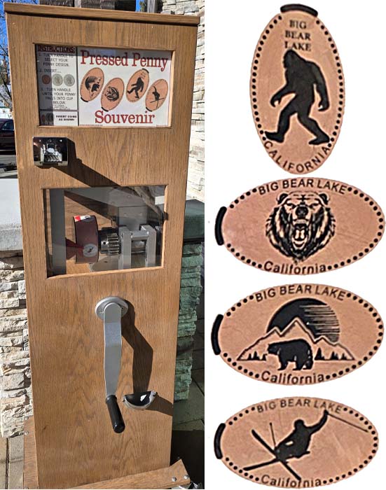 The machine is located outside, on the left of the entrance. All have 'Big Bear Lake California' on them. Designs are: