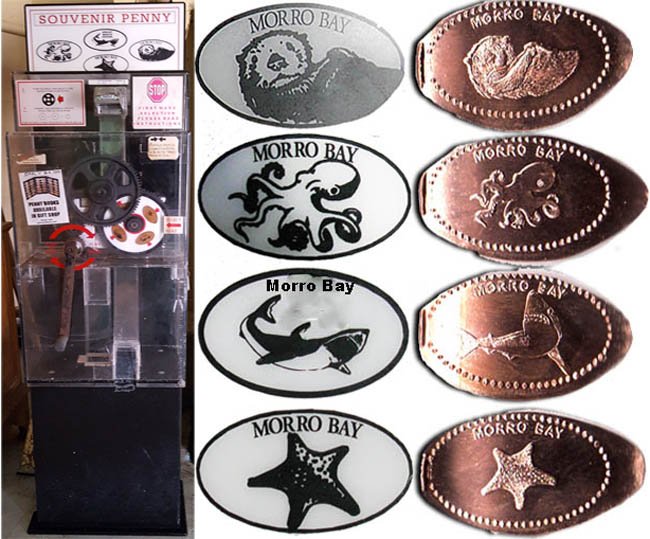 Machine 1 is in the common hallway just outside the inside entry. Cost to press: 51¢ each design. Designs all have a beaded border with 'Morro Bay'.