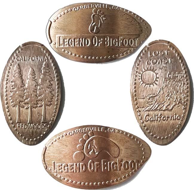 1) 'Legend of Bigfoot Garberville, CA', small footprint facing up over the name in banner,