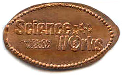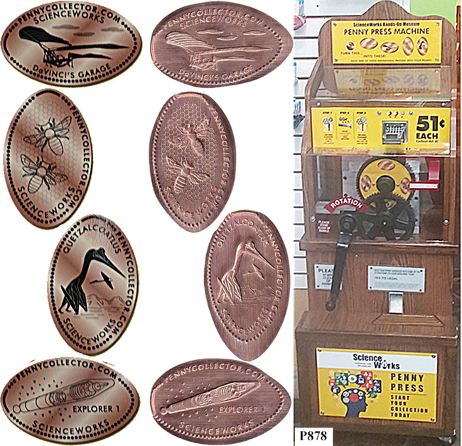Machine 2: is inside to the left, next to the gift shop, before entering the museum. Cost to press: 51¢ each design. Designs all have a pennycollector.com beaded border with 'ScienceWorks':