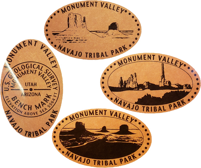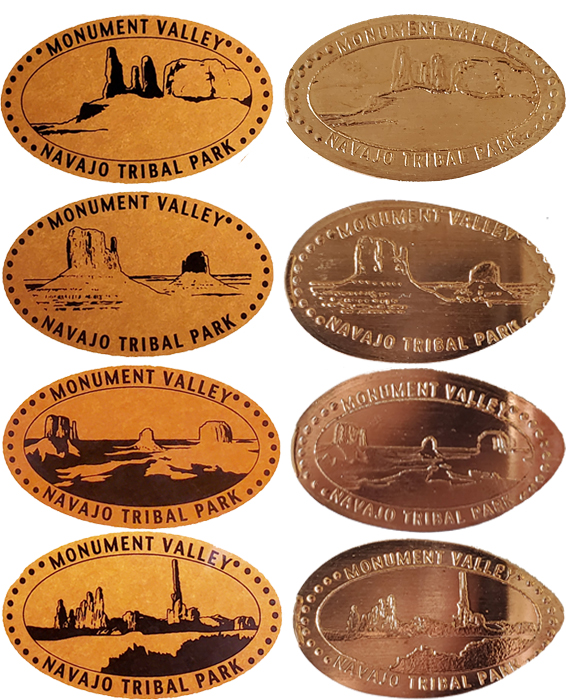 Machine 2: one in the lobby of the left side exit/entrance of the gift shop and door to the viewpoint. All have 'Monument Valley Navajo Tribal Park' on them. Designs are: