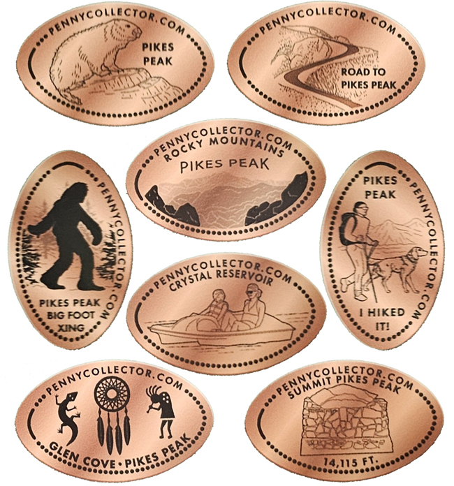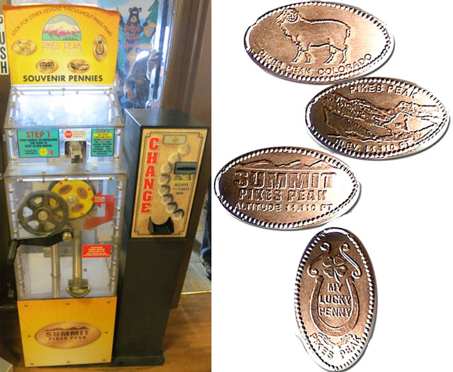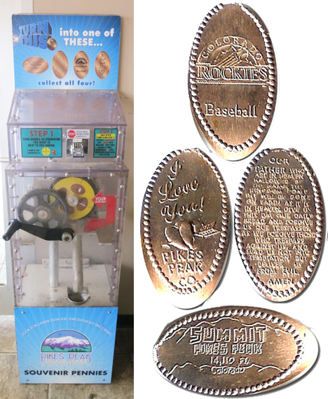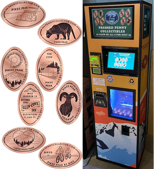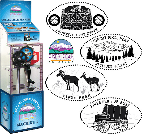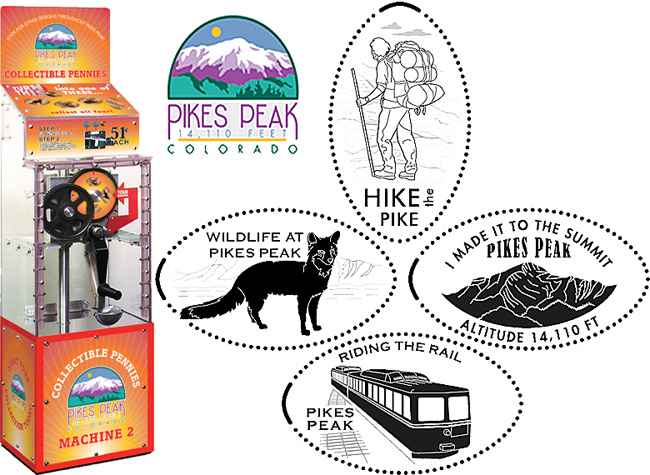 Machine 5 is located in the new Pikes Peak Summit House, just inside the entrance of the museum/exhibit area from the main hallway area. Machine is preloaded with zincs. Cost per design is either $1 each or $5 for all 8 designs. Cash and credit card both accepted (credit card only if you want all 8 for $5). Designs are: