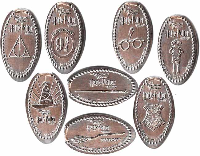 E) Harry Potter 2: (8 designs) 1) Wand, 2) Firebolt broom, 3) Sorting Hat, 4) Harry’s glasses and scar, 5) Hogwarts shield, 6) Dobby the House Elf, 7) Platform 9 3/4 sign, 8) Deathly Hallows symbol.