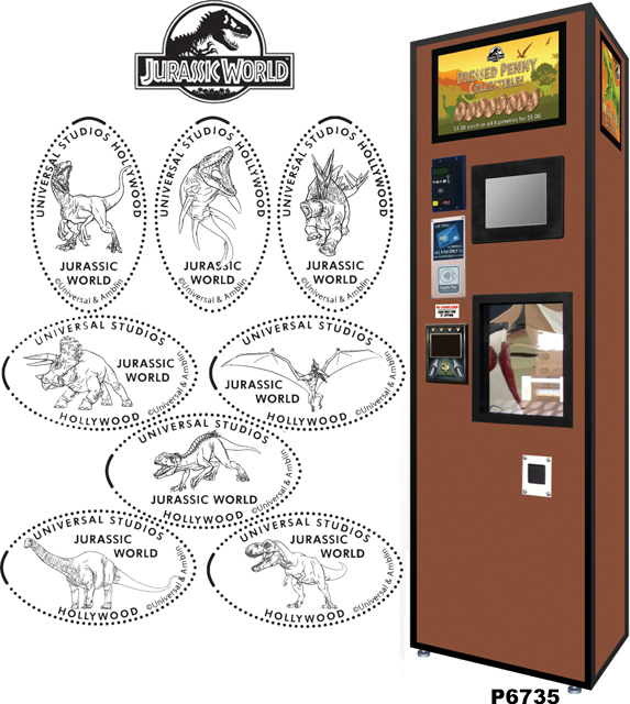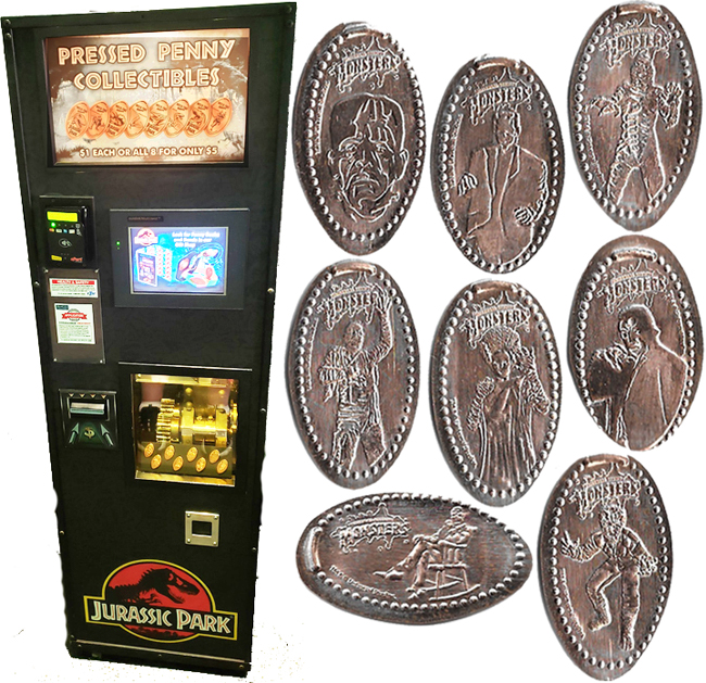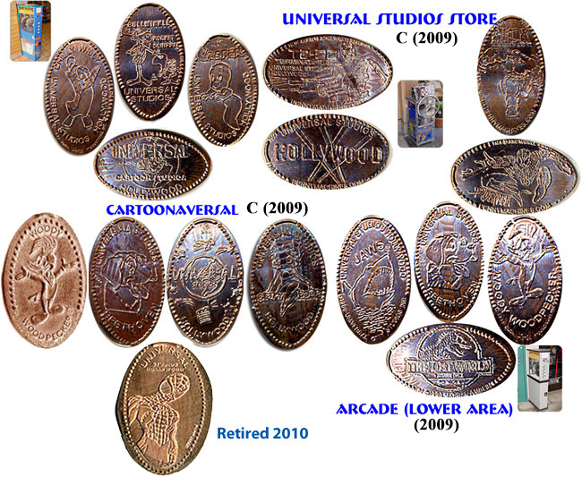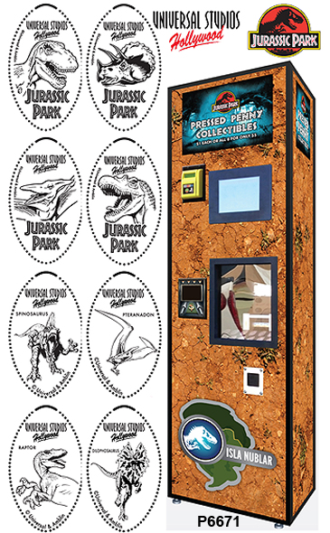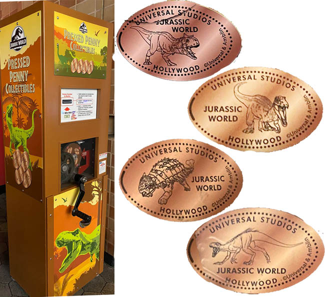 The Jurassic World D machine with 1) Blue (The Raptor), Indoraptor, 3) Carnosaurus, 4) Ankylosaurus has been moved to the Citywalk store called “Universal Studios - Production Central.” Also located at this store is the 8-design machine that was listed under “Universal CityWalk Retired machines.” Its 8 designs are: 1) 'The Simpson's', family, 2) 'I Survived Jaws, Universal Studios, Hollywood', shark, 3) 'Despicable Me, Minions, 4) 'Shrek 4D, Universal Studios California', Shrek and Donkey, 5) 'Spinosaurus, Jurassic Park, Universal Studios California', dinosaur, 6) 'King Kong 360 3D, He's Never Been this Real', King Kong, 7) 'Universal Studios Hollywood', Studio logo, 8) 'Universal Studios California', Oscar.