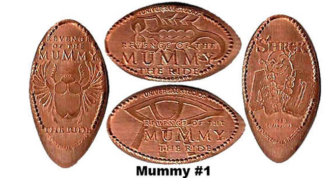 1) Lion head with flames as his mane, 2) 'Universal Studios Hollywood' logo, 3) 'Revenge of the Mummy the Ride Universal Studios Hollywood' logo, 4) 'Revenge of the Mummy the Ride Universal Studios Hollywood', Gennie with the sword.