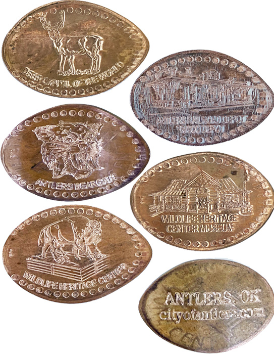 On the backside of the penny it has: Antlers, OK cityofantlers.com.com