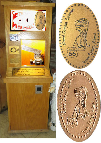 Design 2: "Grand Canyon Caverns" and "Peach Springs, Arizona." Vertical orientation with Route 66 logo and T-Rex, top half, profile.