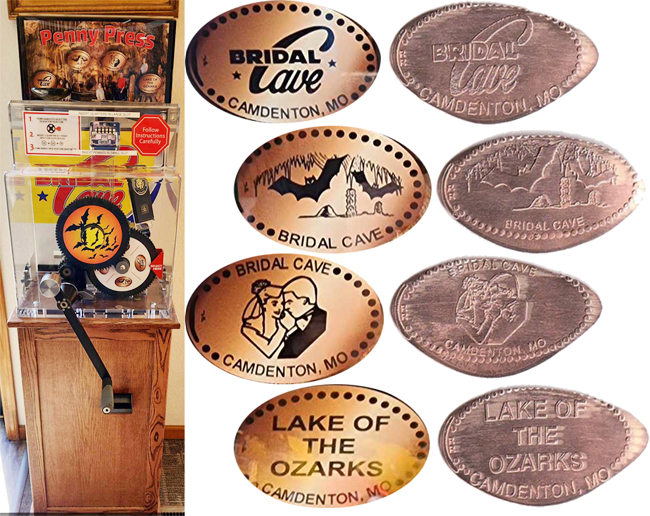 526 Bridal Cave Rd Camdenton, MO , 65020 Phone: 573-346-2676 Website The 4-die manual machine is a Rocky Rockholt machine and is located inside the lobby of the gift shop, near the women's restrooms.