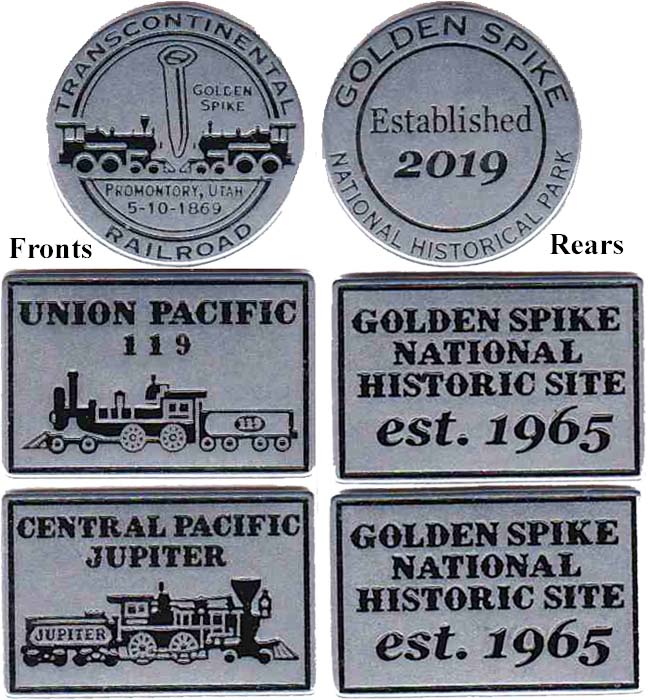 1) Round: Front - A spike between No. 119 and Jupiter trains with 'Transcontinental Railroad Golden Spike Promontory, Utah 5-10-1869' / Rear - 'Golden Spike National Historical Park established 2019'