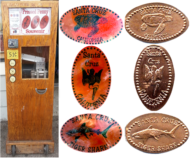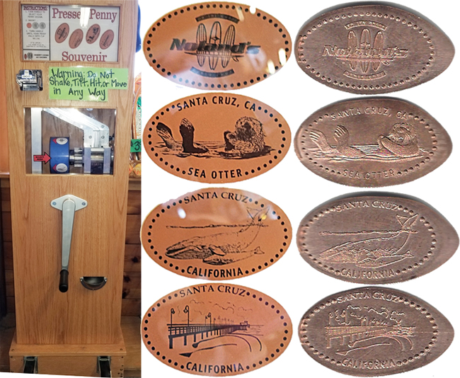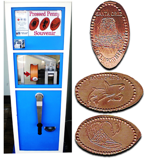 Machine 3 (Placed 2018) is inside the front door. Cost to press: 51¢ each design. Designs all with 'Santa Cruz':