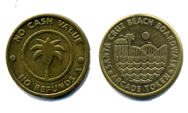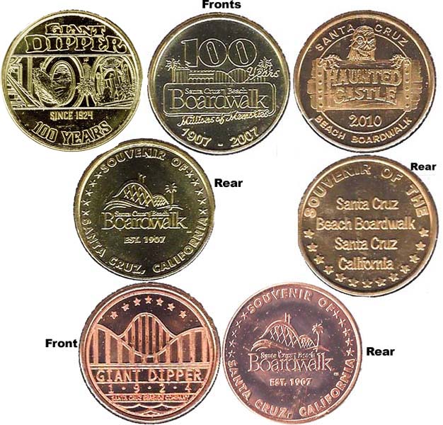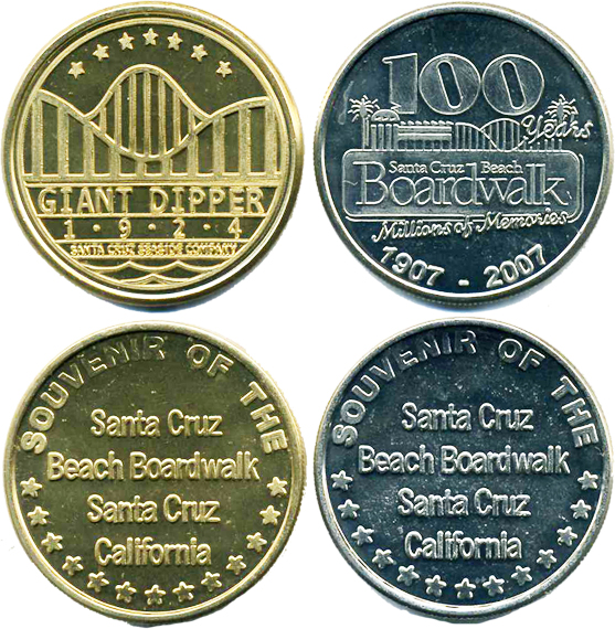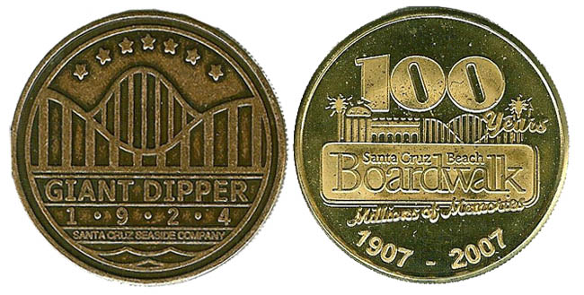 Retired Token Machine 3: 1) Front- '100th Years, Santa Cruz Beach Boardwalk, Millions of Memories 1997 - 2007' 100 over boardwalk area over name over saying over dates/ Rear- Souvenir of the Santa Cruz Beach Boardwalk Santa Cruz, California, 2) Front- Giant Dipper 1924, Santa Cruz Seaside Company/ Rear- Souvenir of the Santa Cruz Beach Boardwalk Santa Cruz, California