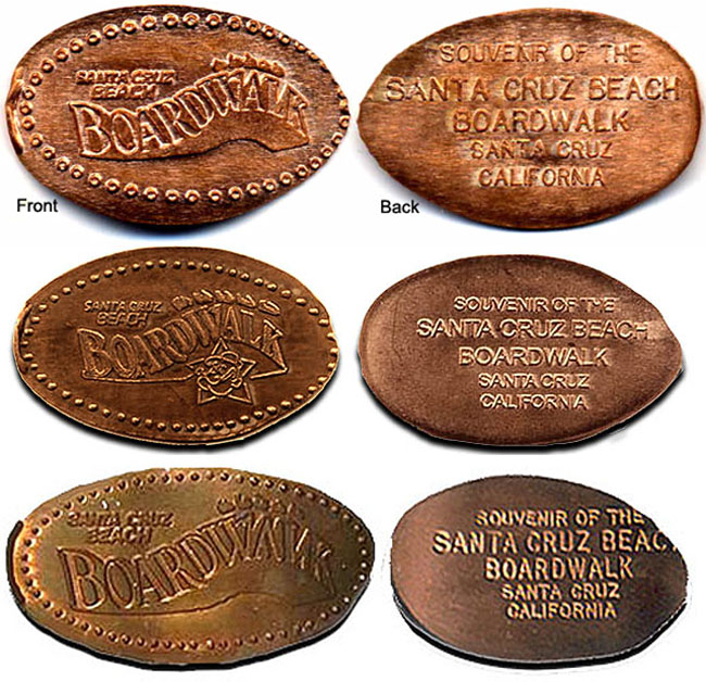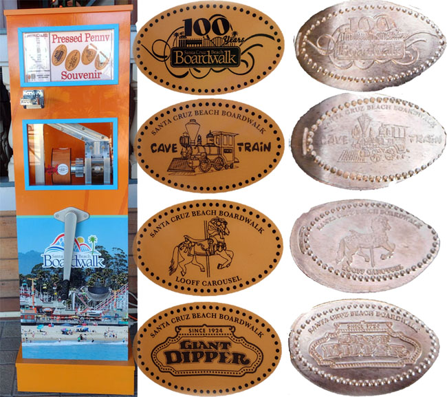 Retired Penny machine 5: 1) '100th Years, Santa Cruz Beach Boardwalk, Millions of Memories/ Rear- Souvenir of the Santa Cruz Beach Boardwalk Santa Cruz, California.