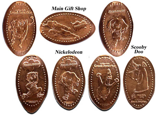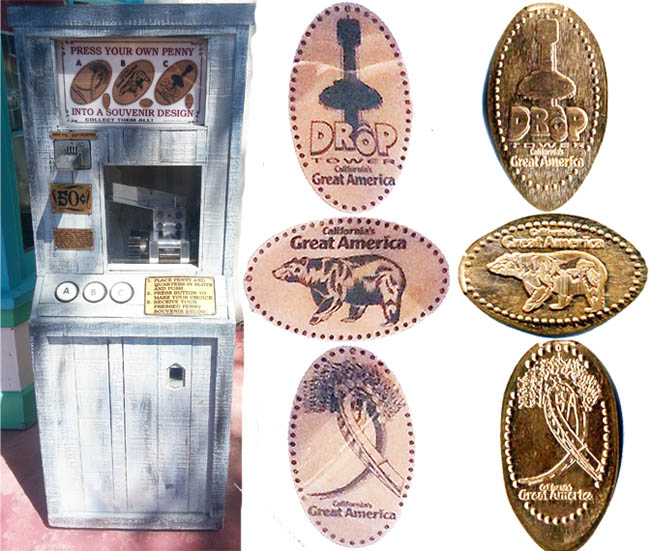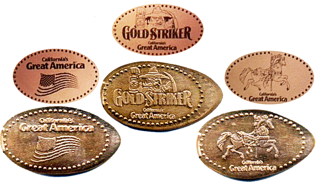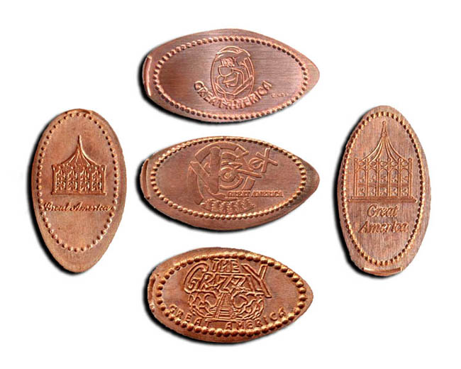 Retired 6: - 1) Carousel top with Park Name under & State name on the upper left, 2) Image of the Grizzley Wooden Rollercoaster, 3) Flight Deck, Jet flying forward over ride name.