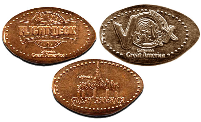 Retired 2: - 1) Carousel top with Park Name under & State name on the upper left, 2) Large Flying American Flag over Park Name, 3) Ride Name, Flight Deck, in Instrument panel.
