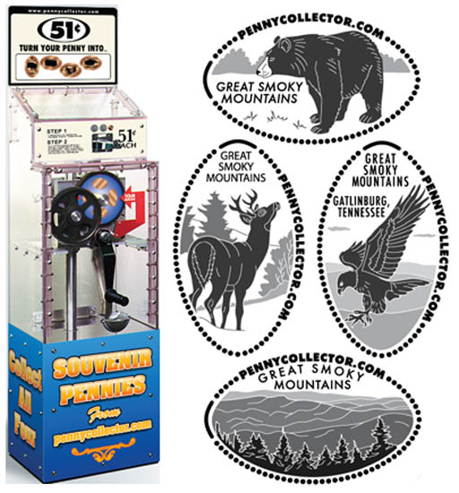 Machine 3:Its in the gift shop by the second door. It's an 8 penny machine that costs $1 for 1 penny or $5 for all 8 pennies. The machine only accepts dollar bills or credit cards and is preloaded with Zinc pennies. Designs are;