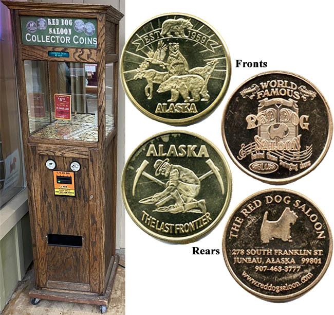 1) 'EST 1958, Alaska', Bear, Wolf, Moose, Rear- 'World famous Red Dog Saloon', logo,