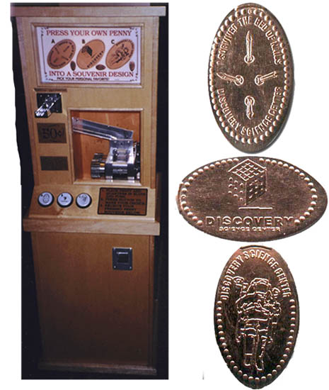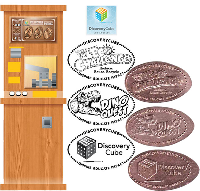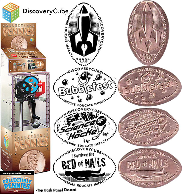 Machine 3 located in the first room after getting your admission ticket checked (between the Welcome Center desk and Physics Lab). Cost to press: 51¢ each design. Designs all with 'Discovery Cube Inspire Educate Impact':