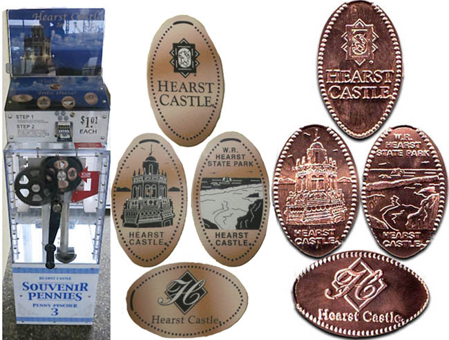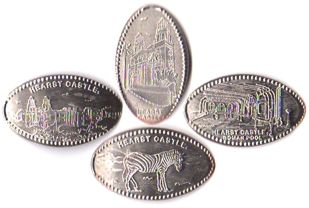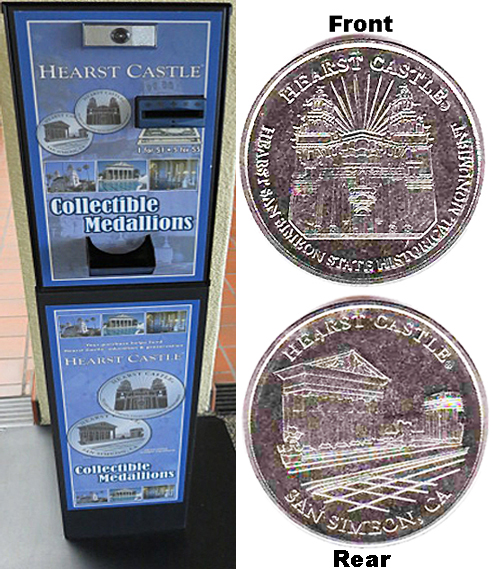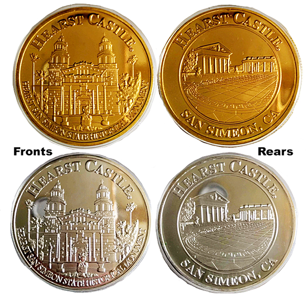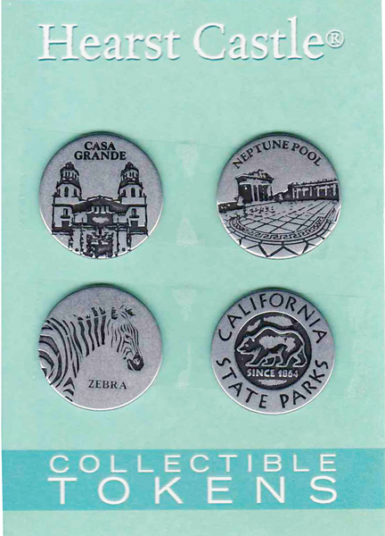 Hours of operation: Monday through Sunday 9:00 am to a seasonally adjusted closing time: call to verify. Closed Thanksgiving, Christmas and New Years days. Tour prices start at: Adults $30, Children 5-12 $15, Children under 5 free. The Hearst Castle 4th edition penny book and the Hearst Castle Collectible token album are for sale in the gift shop for $7.99 each plus tax. The silver and gold tokens are for sale in the gift shop for $12.99 each plus tax. The four 1" mini-token set and the California Republic Collectible token book are no longer available.