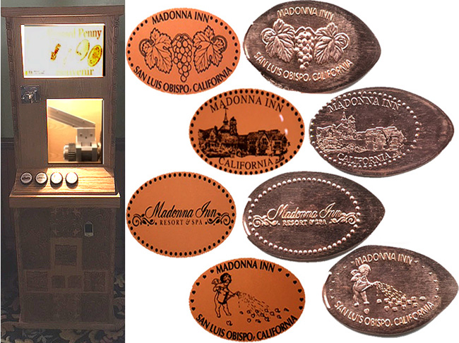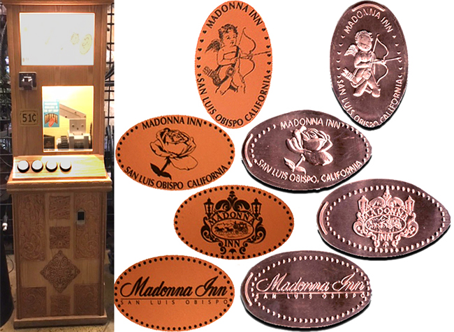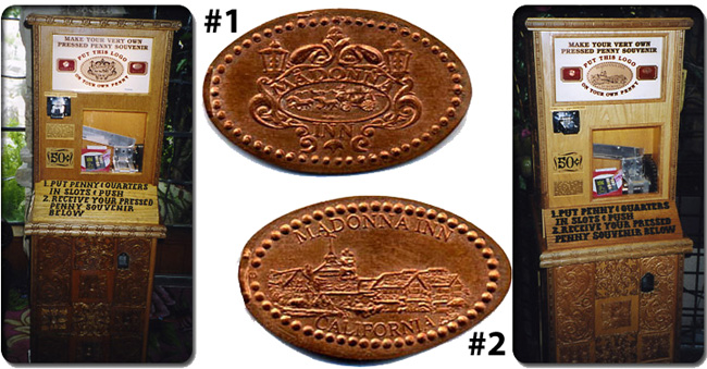 Machine 3 (placed June 2011) is machine is downstairs in the Copper Cafe. Cost to press: 51¢ each design. Designs all with 'Madonna Inn':