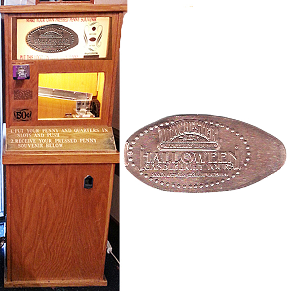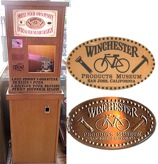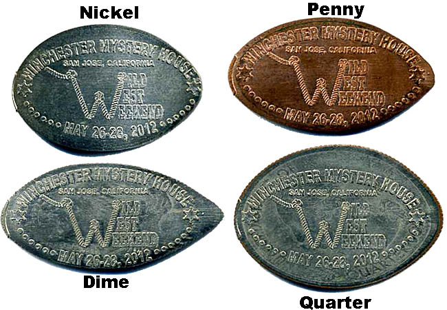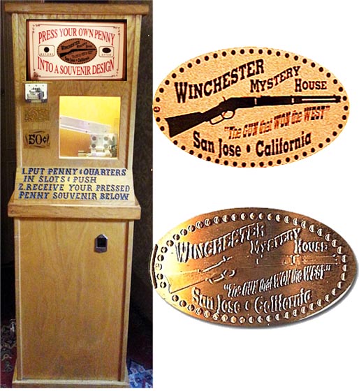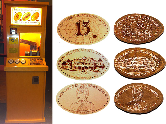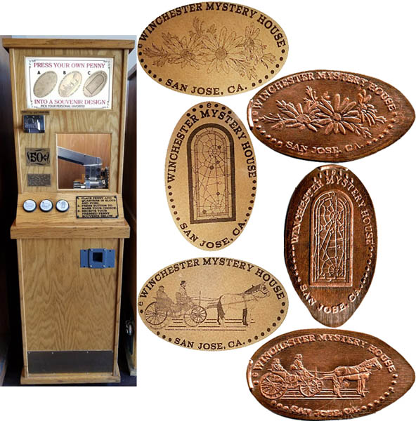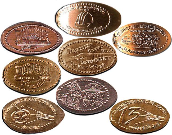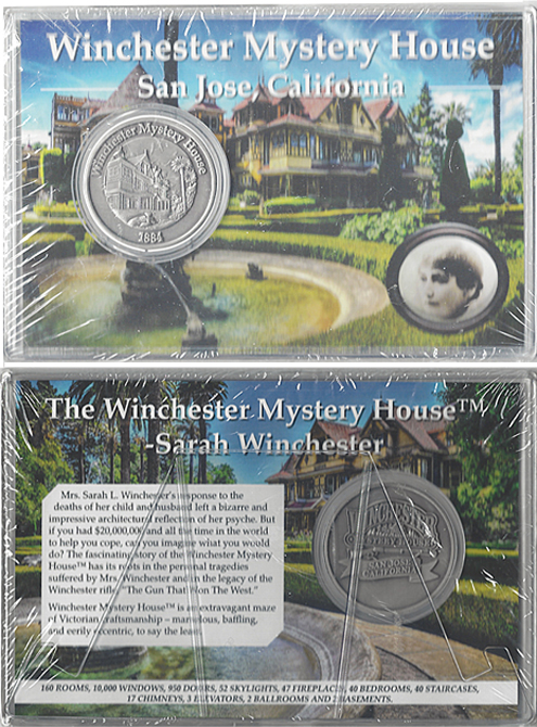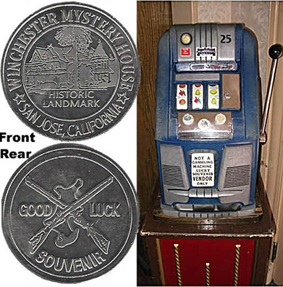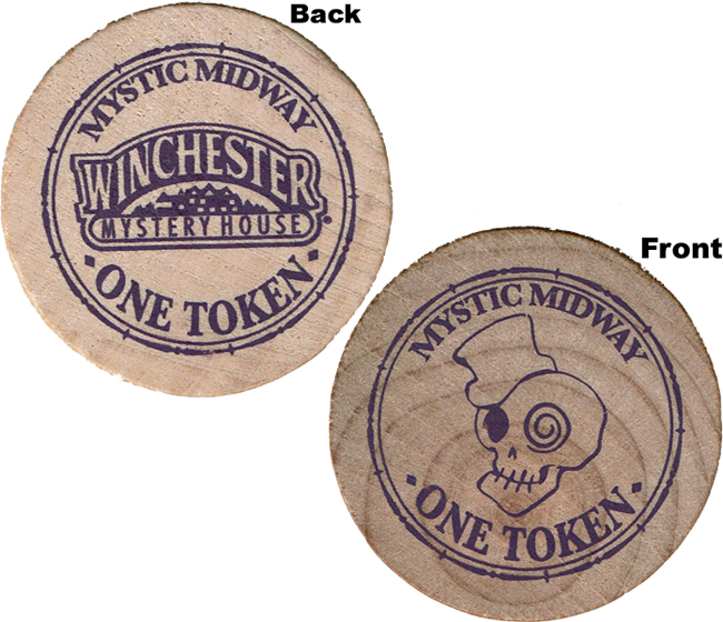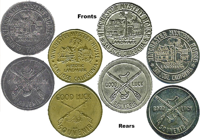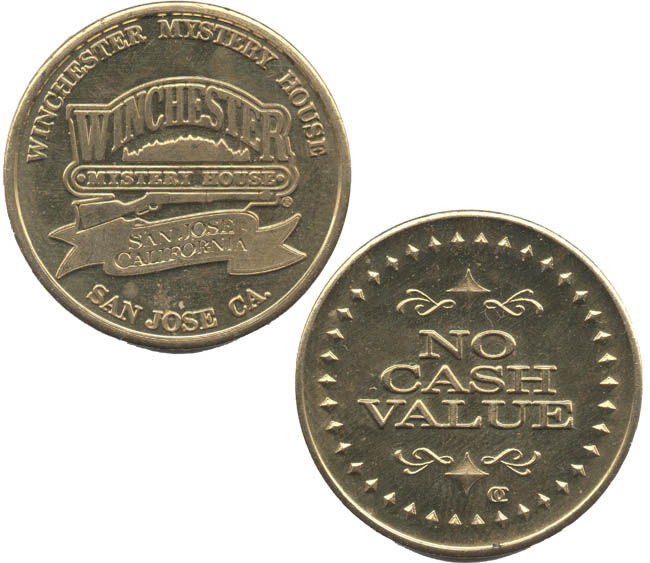 Retired Aluminum Token designs: 1) 'Winchester Mystery House San Jose, California, Historic Landmark', double circle border contains name around the top, City State around the bottom, Landmark under the image of the house in middle, Rear- 'Good luck Souvenir', crossed rifles with powder horn and line design of ghost.