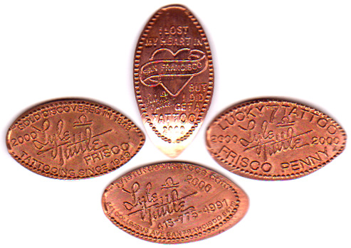 2000: 1) (H) Autograph “Lucky 7 tattoo - 2000- Frisco penny - Lyle Tuttle” 2) (H) Autograph “Lyle Tuttle - 2000- 415-776-4991 -841 Columbus Ave. San Francisco”, 3) (H) Autograph “I was there -Lyle Tuttle 70th birthday party 10-7-2001” (H). 4) (V) Heart with banner “I Lost My Heart in San Francisco-but I did get a tattoo. |