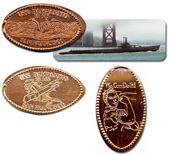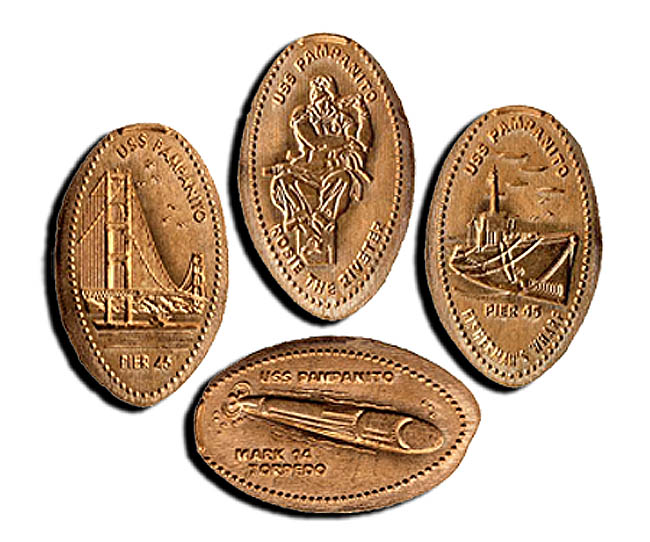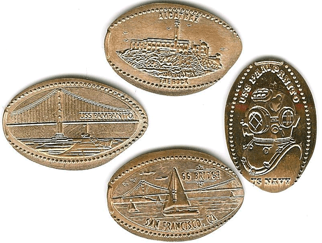 This machine is near the WWII submarine, the USS Pampanito. The machine is located outside the back entrance of the Musee Mecanique museum. The machines are right next to the USS Pampanito ticket booth, near the actual submarine itself. When the weather is bad, they unplug the machines and move them to a backroom behind the small gift shop. The gift shop staff are very helpful and if a machine is out of order, they may have extra imprinted pennies in the cash drawer.