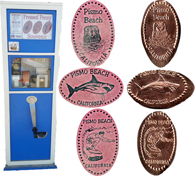 Machine 1 is outside in front of the store. Cost to press: 51¢ each design. Designs all have a beaded border with 'Pismo Beach, California':