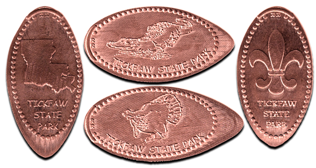 The machine is located in the Nature Center in the Park. Each of the 4 pennies has "Tickfaw State Park" . Designs are: