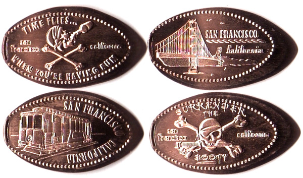 Retired 2: 1) Cable Car, 2) Golden Gate Bridge , 3) Skull and cross bones “Surrender the Booty”, 4) Skull with bottle and cross bones “Time flies”.