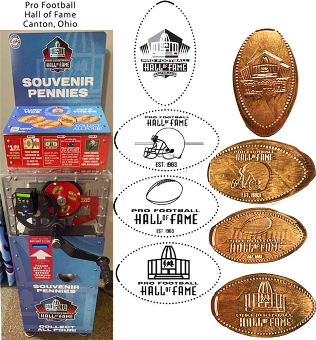 Machine 1 is at the entrance to the gift shop. Cost to press: $1 each design. Credit card automatically charges $4 for all 4 designs. Designs all have a beaded border with 'Pro Football Hall of Fame':