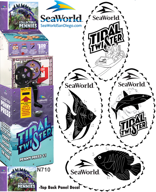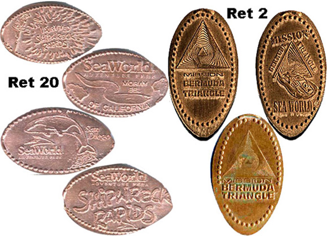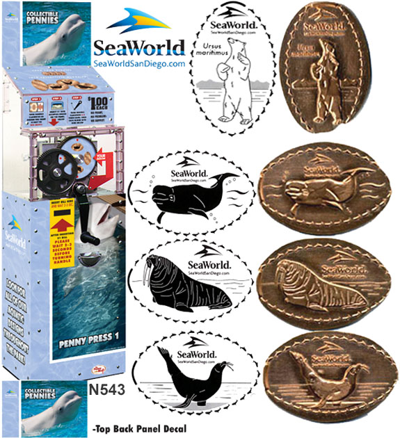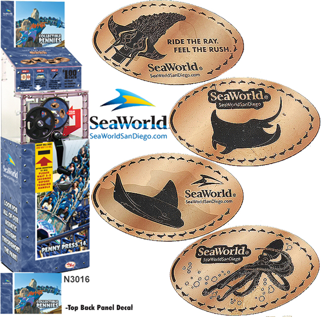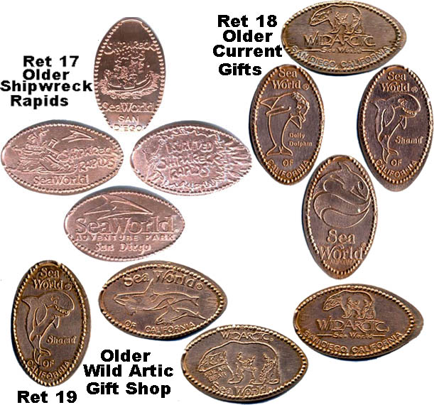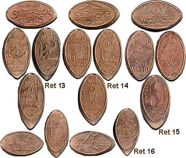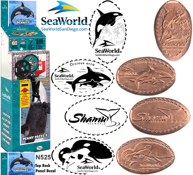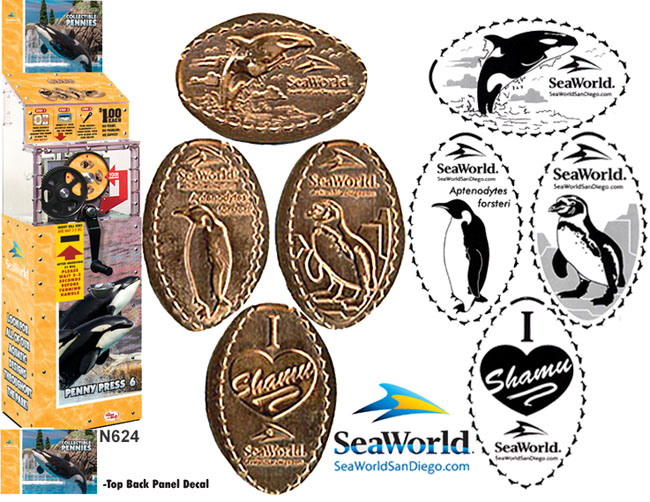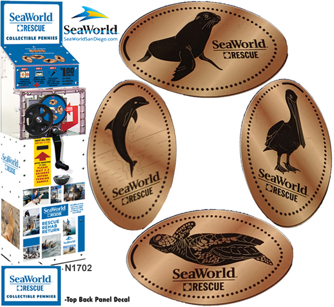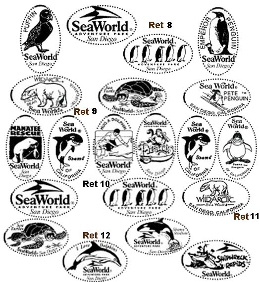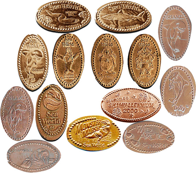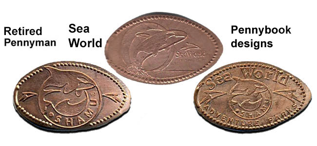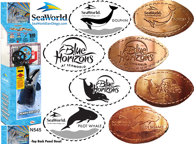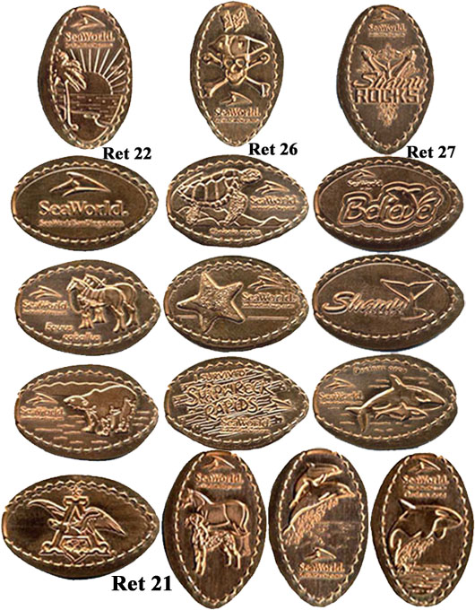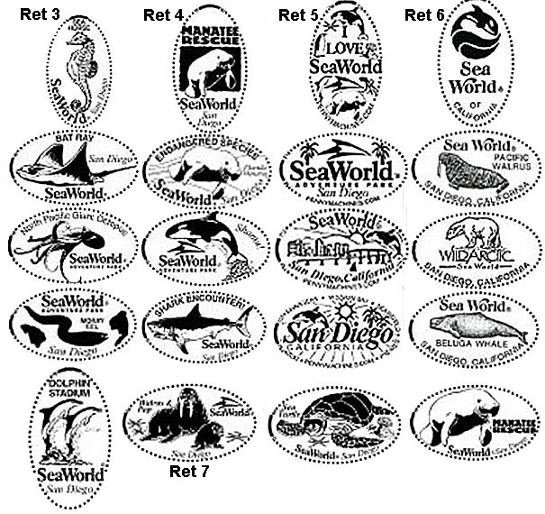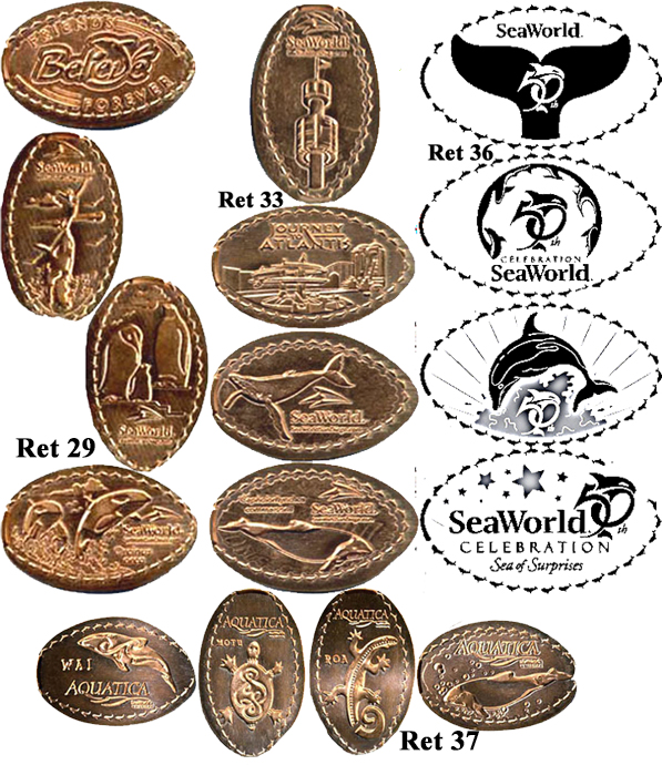 Retired 36: 50th Anniversary SeaWorld Penny Designs) 1. 'SeaWorld 50th', Whale Tale, 2. '50th Celebration SeaWorld', Whale in 50 design, 3. '50', Dolphin 4. 'SeaWorld 50th Celebration Sea of Surprises', Stars and a Whale in 50 design