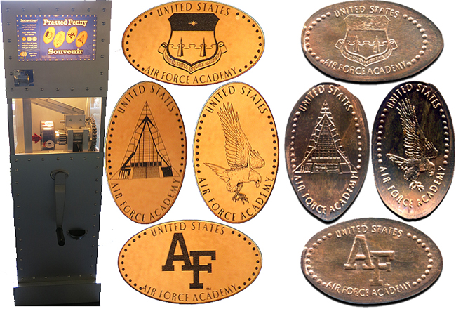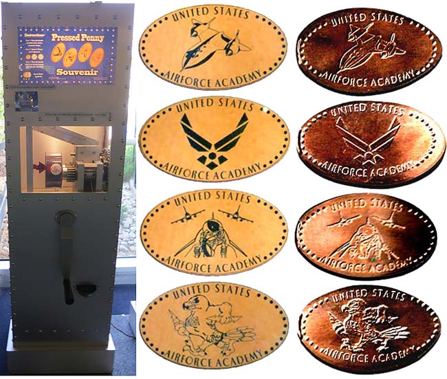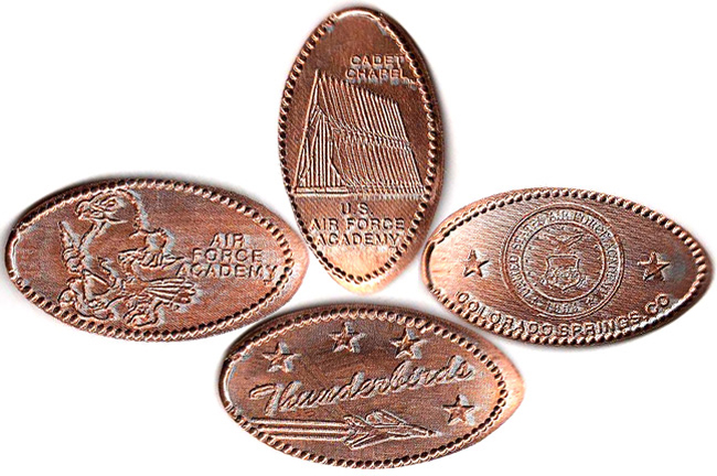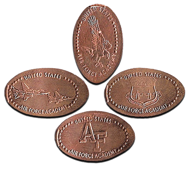 Retired double sided penny: Single, Front- Jets flying through round Air Force Seal/ Rear- Cadet Chapel with four jets flying right in front of it