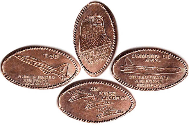 Retired 2: All have "UNITED STATES AIR FORCE ACADEMY" 1) Falcon head, 2) "T-38", 3) "DIAMOND LIL B-52", 4) photo 3 jets.