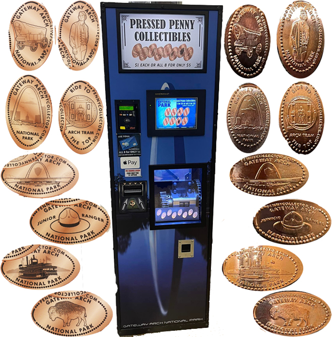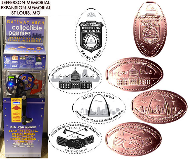 Machine 1 is back by the fudge counter in the far left corner of the gift shop. Cost to press: $1.00 each design (dollar bills only; no quarters accepted). No pennies required. This is a new type PennyCollector machine that accepts a $1.00 bill for each design, or a credit card for a $4.00 charge for all four designs only and after hand cranking, presses a pre-loaded zinc penny. Designs all have 'Jefferson National Expansion Memorial' on them: