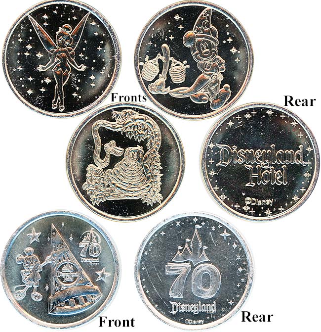 4) Mickey on left of large Sorcerer's hat with 'Disneyland Hotel ' on it, '70 Disneyland'/ Rear- 70 Disneyland' logo