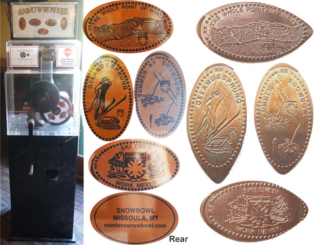 The penny machine is located inside the Last Run Inn building to the right of the bar area by the restrooms. Designs all with the Snowbowl logo: