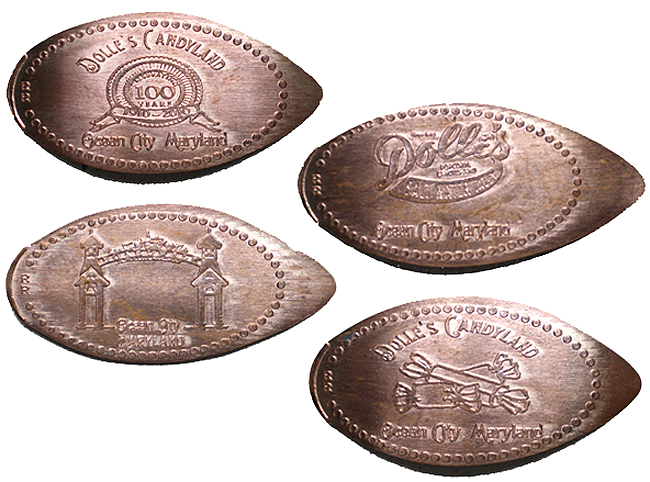 Retired 1: All have 'Ocean City, Maryland' on them: 1) 'Dolle's Candyland 100 years 19810-2010 Ocean City, Maryland', anniversary logo, 2) 'Dolle's Candyland Ocean City, Maryland', logo 3) 'Dolle's Candyland Ocean City, Maryland', candy, 4) 'Ocean City, Maryland', Entrance Structure.