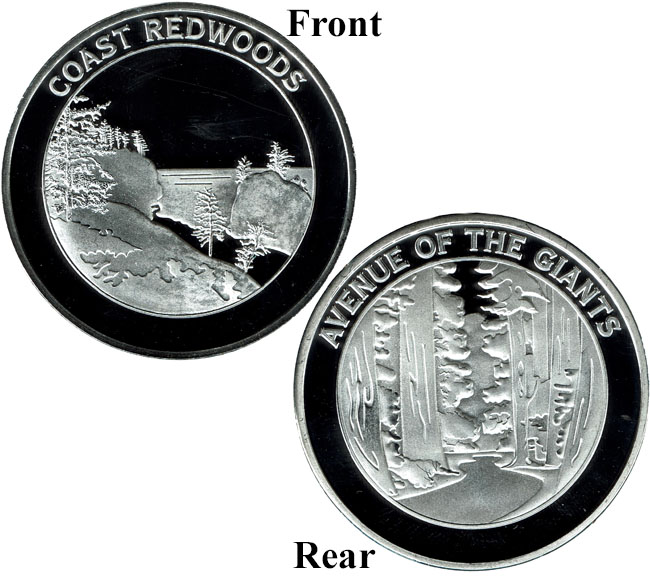 1) 'Costal Redwoods', Image of forest and a lake/ 'Avenue of the Giants', Road through the forest.