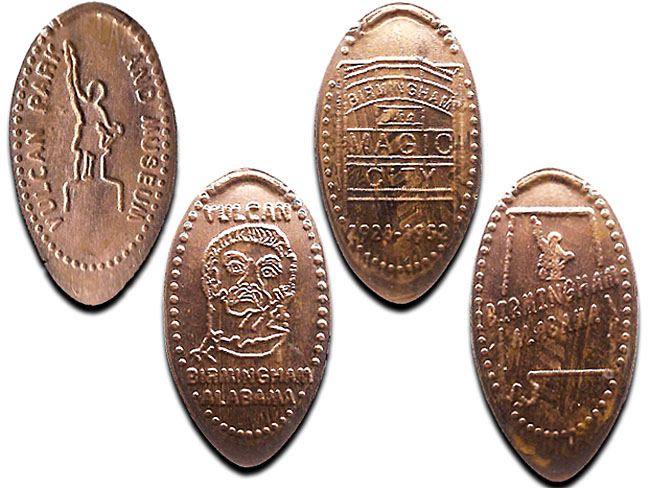 4) 'Birmingham, Alabama', Image of state with statue & Name inside.