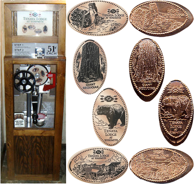 Machine 1 is inside the lodge in the lobby area at the entry to Jackalope's Bar & Grill restaurant. Cost to press: 51¢ each design. Designs all have a beaded border: