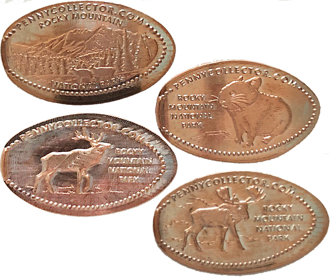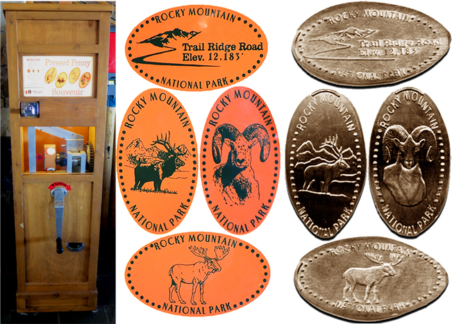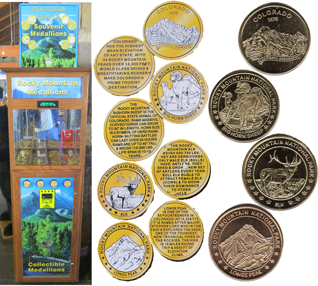 Token Machine 1: all have 'Rocky Mountain National Park' on the front, Designs are: